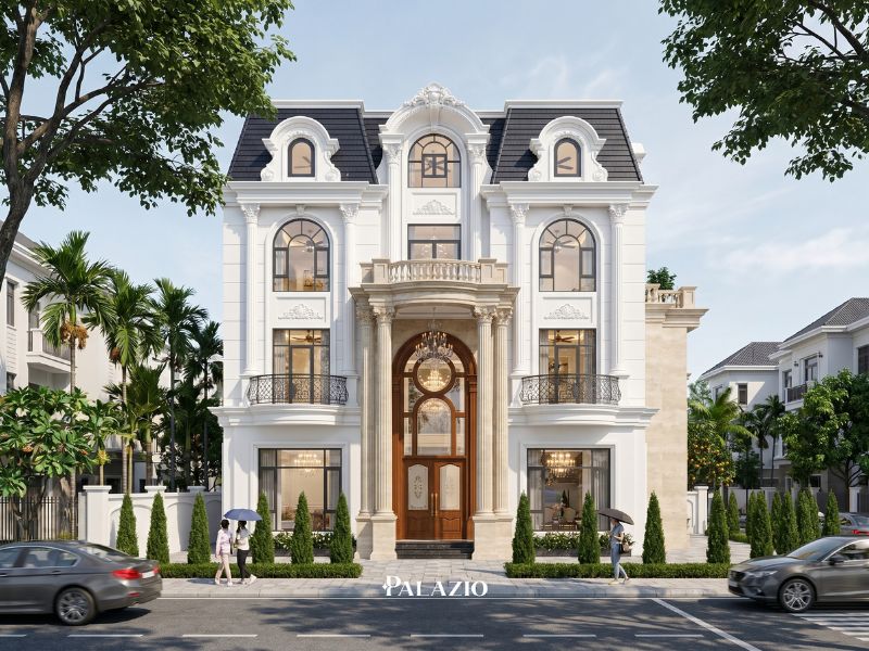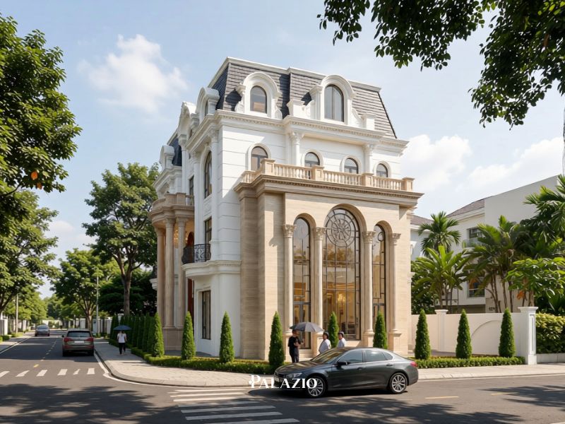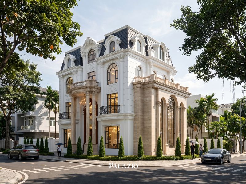 Điểm nhấn đầu tiên chính là hệ mái Mansard quyền quý, xanh đen như màu nước biển hồ, tạo nên vẻ bề thế, uy nghi cho công trình. Những chiếc cửa sổ áp mái dạng vòm hay hình bán nguyệt vừa giúp đón ánh sáng tự nhiên, vừa tạo nên nhịp điệu kiến trúc độc đáo. Gam màu trắng chủ đạo làm nổi bật vẻ đẹp thuần khiết, thanh cao, biến biệt thự thành một cung điện bên bờ biển.