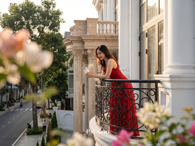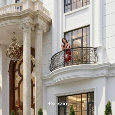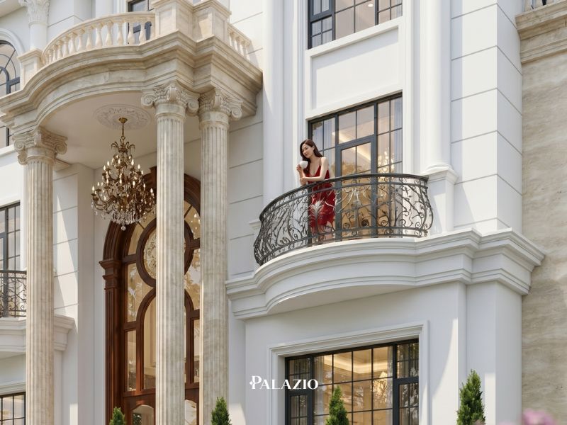 Các ban công uốn lượn bằng sắt nghệ thuật (Wrought Iron) với hoa văn mềm mại là nơi gia chủ có thể tận hưởng làn gió mát từ biển hồ. Tại đây, những chậu cây bonsai được cắt tỉa cầu kỳ hay những khóm hoa rực rỡ không chỉ làm đẹp thêm cho không gian sống mà còn thể hiện gu thẩm mỹ tinh tế của chủ nhân. Cửa chính là một vòm kính lớn, được trang trí bằng khung sắt nghệ thuật, mở ra không gian đại sảnh sang trọng với đèn chùm pha lê lộng lẫy.